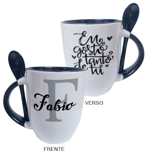 Caneca Personalizada com Colher - Preta Inicial com Nome Masculina e Frase